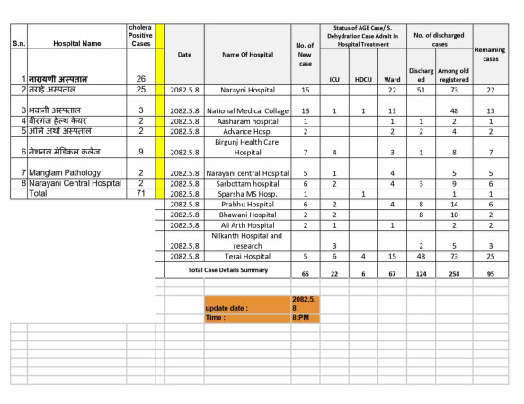 नारायणी अस्पतालमा २६ जना, तराई हस्पिटलमा २५ जना, नेशनल मेडिकल कलेजमा ९ जना, भवानी अस्पतालमा ३ जना, वीरगन्ज हेल्थकेयर हस्पिटलमा २ जना, अलि हस्पिटलमा २ जना, नारायणी सेन्ट्रल अस्पतालमा २ जना र मंगलम डाइग्नोसिस सेन्टरमा २ जना बिरामीको उपचार भइरहेको छ । यस्तै, झाडापखाला र शंकास्पद हैजाका १६१ जना बिरामी विभिन्न अस्पतालमा उपचाररत छन् ।