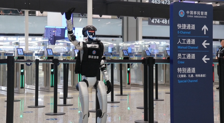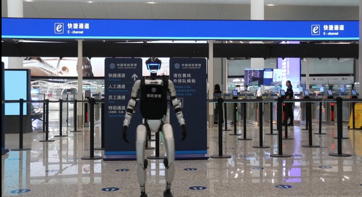 हाङझाउ सियाओशान अन्तर्राष्ट्रिय विमानस्थलको सीमा निरीक्षण क्षेत्रमा, मानवरूपी रोबोटहरू टर्मिनलमा घुम्ने गरेका छन् ।